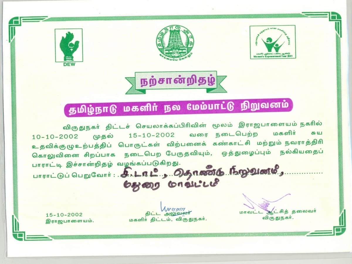 | 3 | SJSRY & SEDP (Socio Economic development programme ).IWDP (integrated water shed development programme ) SGSY Skill training and EDP and capacity building | Madurai Corporation, Tirupur corporation,Tamilnadu Corporation for Development of Women - Mahalir Thittam,Municipal administration (Municipality) District rural development Agency | 2011-2012 | 1900 | 11747615 | Madurai city, madurai rural dindugal, krishnagiri,nagapatinam , Nilgris ,Pudukotai,Ramnad,Theni,Tirunelveli , tirupur , tiruvallur , tiruvarur , trichy , vilupuram , virudunagar | Diary produts , Brick kilin , Masonry , Coir products , goat rearing, Floriculture , Readymade garments ,Clay toys , Handicrafts ,Sanitary napkins ,Paper plates ,Paper cup ,Areca sheet plates ,Charcoal making ,File pad , Appalam vadagam making ,Fur toys , Jardoshi and kundan works Agriculture training |